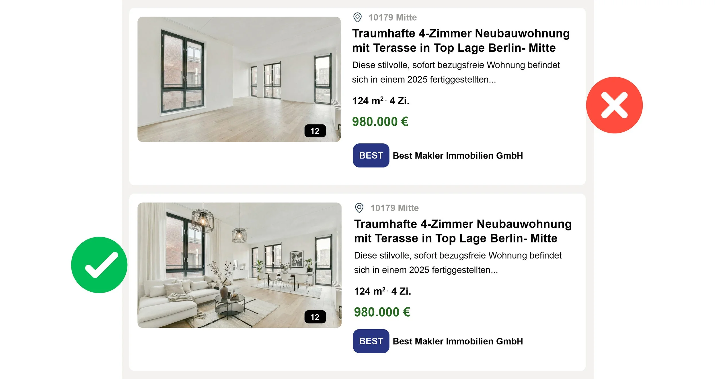 Leerstehende Räume wirken online oft kleiner, kälter und schwer vorstellbar.